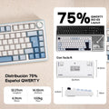 F75 Español es un teclado mecánico versátil y compacto con un diseño del 75%, montaje de junta cómodo, personalización de intercambio en caliente, impresionante RGB de 16,8 M, conectividad de tres modos y una potente batería de 4000 mAh para juegos ininterrumpidos.